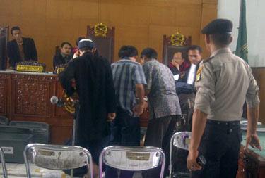 Umar Patek dan istrinya, Rukayyah mesra saat dipertemukan dalam rekonstruksi bom Bali I. Di kos-kosan Umar terdahulu di Kampung Melayu, Umar terus merangkul bahu istrinya itu.