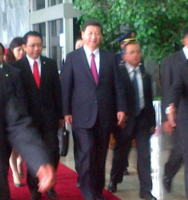 Presiden Republik Rakyat Tiongkok Xi Jinping menyampaikan pidato di Gedung DPR, Senayan, Jakarta bersama ketua DPR Marzuli Alie. Xi Jinping membuka pidatonya dengan menyapa dalam bahasa Indonesia.