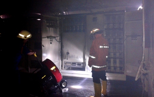 Kebakaran melanda lantai basement pusat pertokoan alat listrik Kenari Mas, Salemba, Jakarta Pusat. Api muncul dari ruangan genset yang berada di samping parkir mobil.