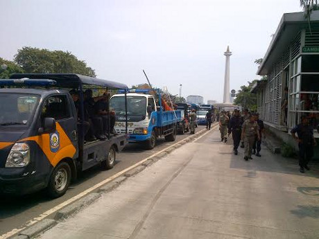 Ratusan petugas Satpol PP dan UP Taman Monas menggelar razia pedagang kaki lima di kawasan tersebut. Petugas mengangkut barang dagangan pedagang-pedagang yang mangkal di taman kota tersebut.