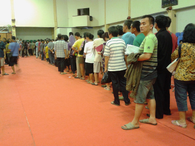 Ribuan pedagang korban kebakaran Blok 3 Pasar Senen Jaya berkumpul di Gelanggang Olahraga Senen. Mereka mengantre untuk mendapatkan kios di tempat penampungan sementara (TPS) Blok 5.