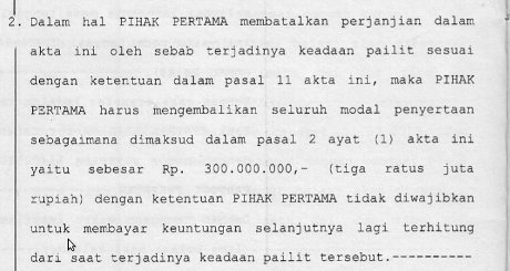 Dalam perjanjian penyertaan modal dengan para mitra, Koperasi Cipaganti sudah memiliki klausul bila terjadi pailit. Nasib duit modal para mitra yang mencapai ratusan juta rupiah pun sudah ditentukan. Seperti apa isinya?