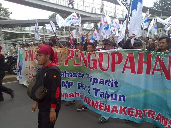Sebanyak 2.000 orang buruh melakukan demo di Jalan HR Rasuna Sahid, Kuningan, Jakarta Selatan. Buruh tersebut berdemo dengan berjalan kaki (long march) menuju kantor Kemenakertrans di Jalan Gatot Subroto.