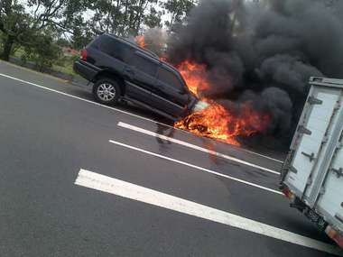 Sebuah mobil Land Cruiser terbakar di Km 126 Tol Purbaleunyi arah Bandung. Akibatnya lalu lintas di kawasan tersebut macet.