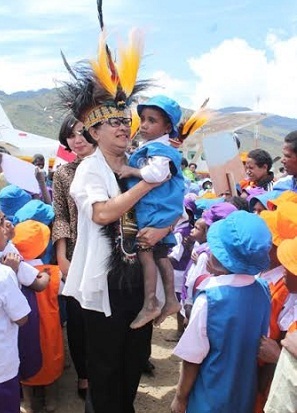 Menteri Pemberdayaan Perempuan dan Perlindungan Anak, Yohana Susana Yembise berkunjung ke Kabupaten Lanny Jaya, Papua. Yohana menitikkan air mata saat disambut ratusan anak sekolah.