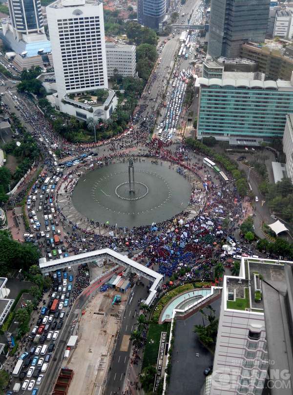 Demo buruh membuat lalu lintas di Bundaran HI kacau. Massa yang berkumpul di kawasan ini membuat kendaraan kesulitan untuk melintas. Kendaraan banyak tertahan di sekitar HI.