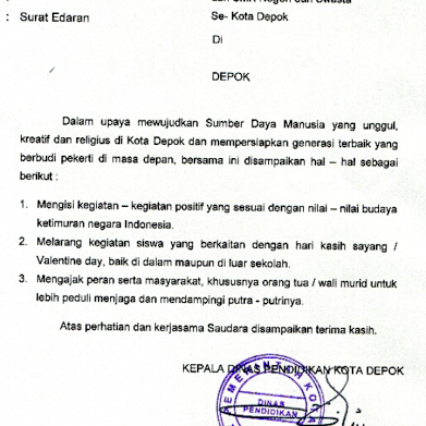 Dinas Pendidikan Kota Depok, Jawa Barat melarang perayaan hari kasih sayang alias valentine di sekolah. Para siswa diharapkan mengisi kegiatan di tanggal 14 Februari dengan hal positif yang sesuai budaya ketimuran.