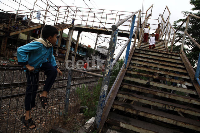 Kondisi memprihatinkan terlihat dari jembatan penyeberangan orang (JPO) di atas pelintasan kereta api di kawasan Tebet, Jakarta Selatan. Selain tidak beratap dan berlubang, JPO itu juga penuh sampah dan terkesan kumuh.