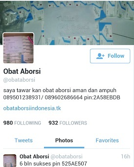 Obat aborsi dijual melalui media sosial seperti yang dilakukan akun Twitter @obataborsi. Akun tersebut menawarkan obat penggugur kandungan dan menampilkan janin hasil aborsi para pelanggannya.