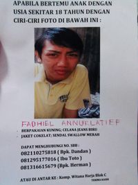 Fadhiel Annurlatief (18) belum kunjung kembali usai menonton acara lomba Agustusan. Belum diketahui keberadaan remaja asal Pamulang ini.
