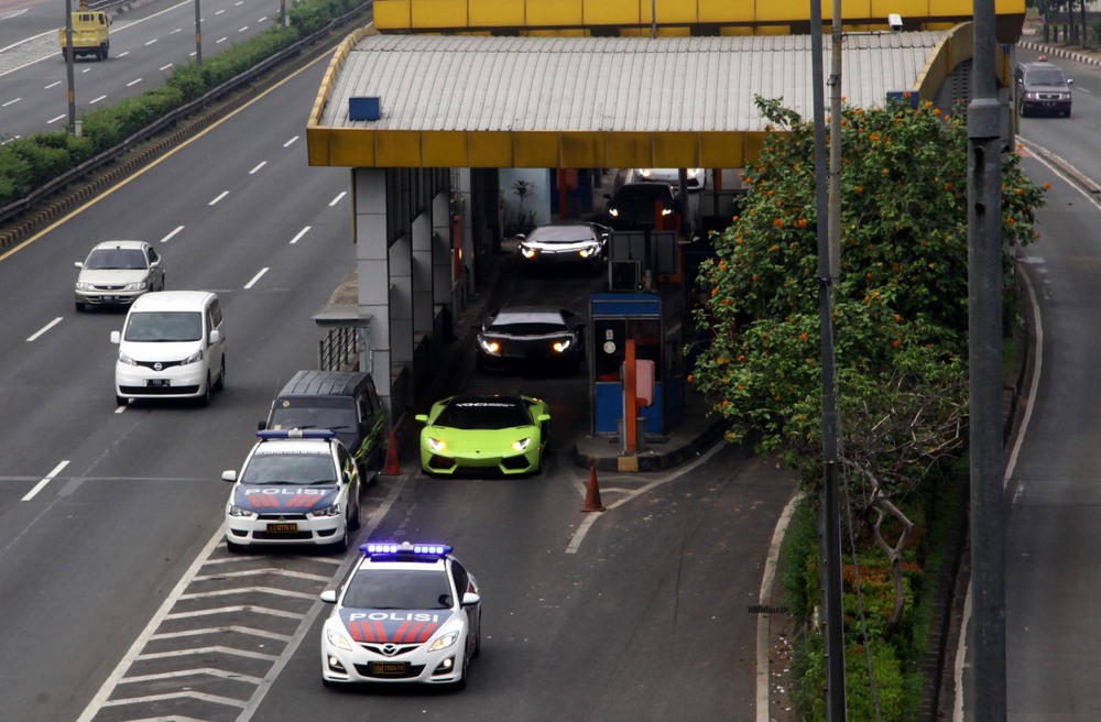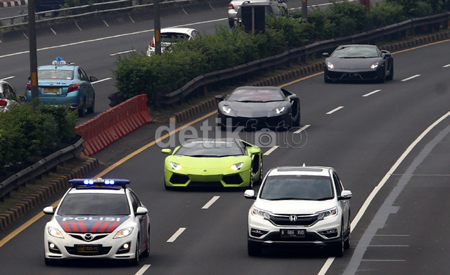 Sekitar 9 mobil Lamborghini konvoi di SCBD, Jakarta Selatan, dapat pengawalan kepolisian. Namun sebagian besar dari mobil mewah itu tak dilengkapi plat nomor polisi (nopol) bagian depannya.