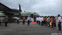 Presiden Jokowi tiba di Nias dengan menumpang pesawat TNI AU CN-295. Kedatangannya disambut warga.